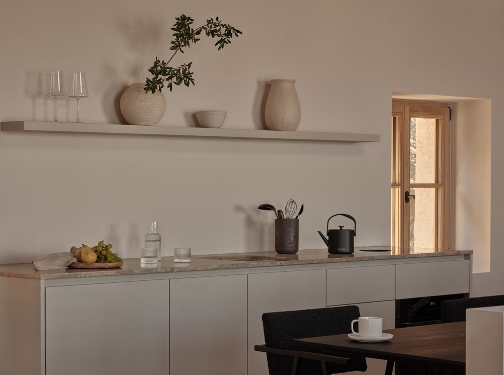 Cucina di design con minibar, macchina per caffè espresso, stoviglie e vari utensili da cucina