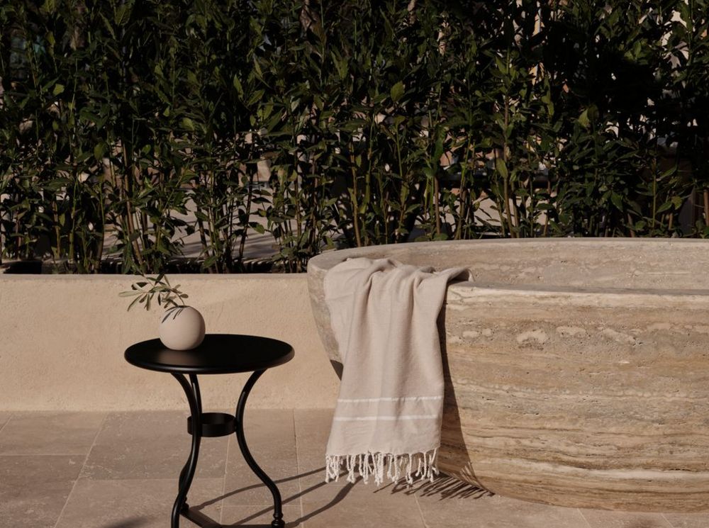 Highlight: caminetto aperto nell'area living, terrazza con vasca da bagno freestanding in marmo e rituale di balneazione